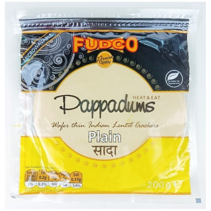 Zloženie: múka urad dal, soľ, jedlá sóda (E500), olej z bavlnkového semena, asafoetída.