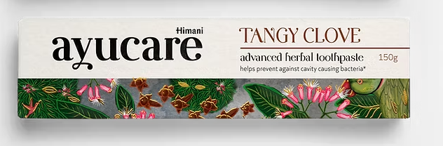 Zubná pasta AYUCARE s klinčekom a eugenolom, čo je extrakt z klinčeka napomáhajúci k prirodzenej čistote ústnej dutiny. Ďalšie prírodné zložky, ktoré táto zubná pasta obsahuje sú mäta, čajovníkový olej a extrakt z čajovníka čínskeho.