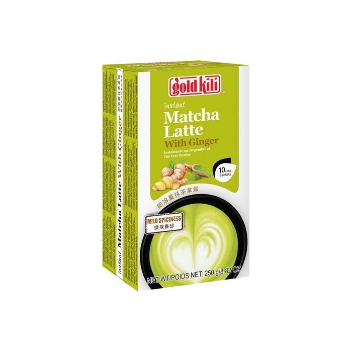 Zloženie: Zmes sušenej smotany (42 %), glukózový sirup, plne hydrogenovaný rastlinný tuk (kokosový olej, palmojadrový olej), odtučnené mlieko v prášku, stabilizátor (difosforečnan draselný - E340ii), emulgátor (mono-a diglyceridy mastných kyselín - E471)), protispekavá látka (oxid kremičitý - E551), farbivo (betakarotén - E160a), instantný zázvorový prášok (15,6 %), trstinový cukor, glukóza, maltóza, fruktóza, cukor, čajový prášok matcha, aróma. Obsahuje: mlieko.